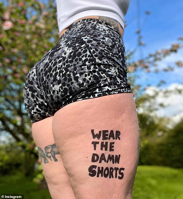 Ibu Cox menjadi bintang viral pada tahun 2020 selama pandemi Covid ketika dia memposting gambar dari slogan tersebut - sebuah seruan untuk kepercayaan diri terhadap tubuh yang dia ciptakan untuk adik perempuannya - di pahanya.