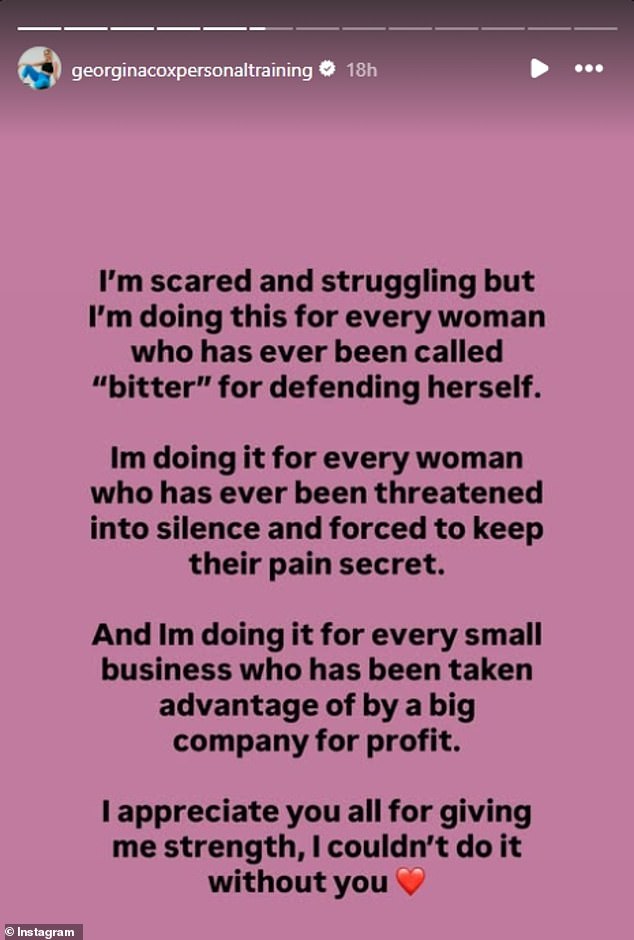 Dalam pernyataan di Instagram pada Kamis, Ms Cox mengatakan: "Saya takut dan sedang berjuang, tetapi saya melakukan ini untuk setiap wanita yang pernah disebut 'pahit' karena membela dirinya.