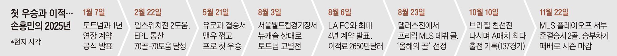Meskipun musim 2025 berakhir secara mengecewakan, tahun tersebut merupakan tahun yang bermakna bagi Son Heung-min. Terutama, momen ketika ia mengangkat trofi profesional pertamanya dengan mengalahkan Manchester United 1-0 dalam 'Final Liga Eropa' pada Mei sambil memakai seragam Tottenham tetap menjadi puncak karier sepakbolanya. Setelah mencetak 173 gol untuk Tottenham dan menjadikan dirinya sebagai legenda, ia menyelesaikan bagian terakhir dari teka-teki tersebut—trofi juara—dan memulai tantangan baru dengan pindah ke LAFC pada Agustus.
